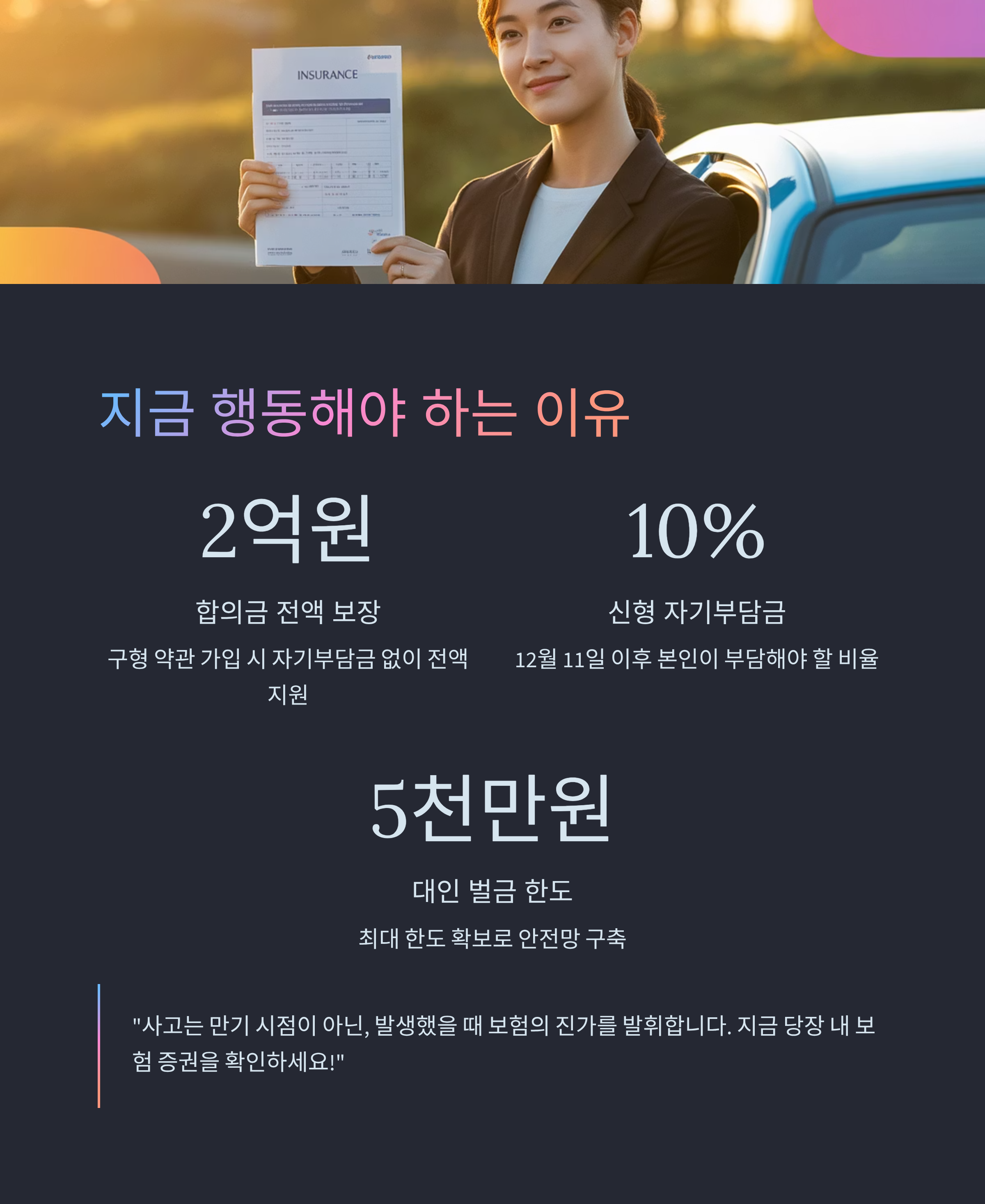 | 1단계 (긴급 확인) | 현재 가입된 보험의 **'갱신 여부'** 및 **'교통사고 처리 지원금'** 약관 확인. | 자기부담금 유무, 경찰조사 보장 여부 체크 |